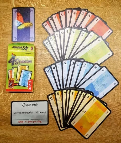 Beschrijving van 4 Seasons – Kaartspel – 999-SEA01 : Tactisch slagenspel voor 3 of 4 spelers. Voorspel met 2 of 3 kaarten uit je hand hoeveel slagen je gaat halen. Laat je de andere spelers zien hoeveel slagen je wilt halen, dan kun je een mooie bonus verdienen. Met spannende teamvariant!