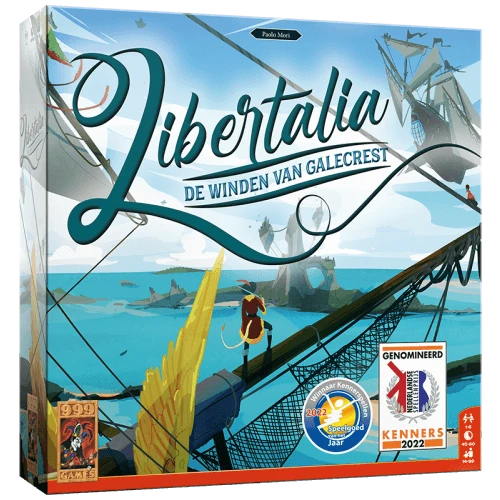 Beschrijving van Libertalia – 999-LIB01 : De eilanden van Galecrest zitten vol met buit. Als luchtpiraat ga jij de strijd om roem en rijkdom aan. Je leidt je eigen bende piraten, die je een voor een naar de verschillende eilanden stuurt. Rang en reputatie bepalen of jij de buit binnensleept. In Libertalia krijg je per ronde een aantal karakterkaarten, waarvan je er vervolgens per beurt één in moet zetten. Elke speler heeft dezelfde karakterkaarten. De hoogste karakterkaart die op een eiland is geplaatst, wint de buit. Bij gelijkstand wint de speler met de beste reputatie. Zwakkere piraten kunnen echter nog een tactische rol spelen in de nachtfases, die na de eilandfases plaatsvinden. Libertalia is een tactisch spel, waarbij je goed moet letten op wat je tegenspeler van plan is. Jullie hebben immers allebei dezelfde kaarten op handen! Hierdoor ontstaat een spannend kat-en-muis-spel. Wie zet het slimst de karakterkaarten in en gaat er met de buit vandoor? Libertalia bevat ook speciale automa-regels voor solospelers!