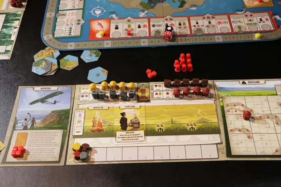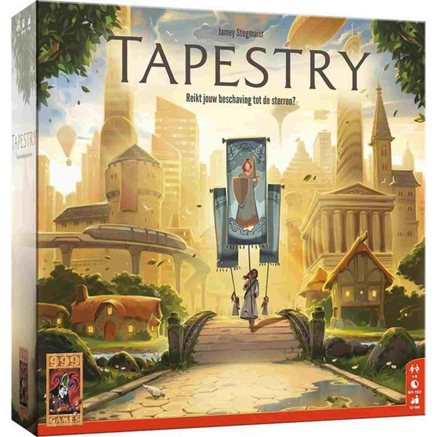 Beschrijving van Tapestry – 999-TAP01 : Een strategisch ontwikkelingsspel van succesauteur Jamey Stegmaier. In Tapestry weef je het verhaal van jouw eigen, unieke beschaving. Je start met niets en ontwikkelt je op de 4 ontwikkelingssporen (wetenschap, technologie, ontdekkingsreis en militair) om steeds betere beloningen en voordelen te ontvangen. Je kunt je op een specifiek spoor richten of voor een evenwichtige aanpak kiezen. Verbeter je inkomen, bouw aan je hoofdstad, buit je unieke vaardigheden uit en trek tapijtkaarten, die het verhaal van jouw beschaving vertellen. Reikt jouw beschaving tot de sterren?