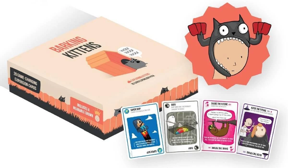 Barking Kittens is na Imploding Kittens en Streaking Kittens de derde uitbreidingsset voor Exploding Kittens. Voeg 20 nieuwe kaarten toe aan de stapel om het spel nog uitdagender te maken, waaronder de Barking Kitten kaart waarmee je een andere speler zomaar kunt laten ontploffen… En wat te denken van de Kattenkroon? Als je deze kaart uitspeelt zet je de kattenkroon op je hoofd en leg je daar kaarten in. Als iemand een kaart van jou wil stelen, dan moet diegene blind een kaart uit de kroon pakken. Hilarisch!