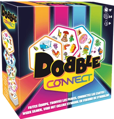Beschrijving van Dobble Connect – ASM01-18 : In dit spannende spel probeer je het snelste team te zijn dat 4 kaarten van jouw kleur op een rij weet te verbinden! Om een kaart te plaatsen, benoem je zo snel mogelijk het gelijke symbool tussen de kaart en een van de eerder geplaatste kaarten. Wees snel, maar vergeet niet om de andere teams te blokkeren!