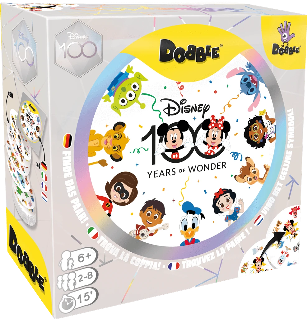 Beschrijving van Dobble Disney 100 – 95933 : In de speciale editie Dobble van Disney 100 moeten spelers het paar vinden tussen populaire Disney- en Pixar-personages. Er is altijd precies één overeenkomend symbool tussen twee kaarten. Dobble Disney 100 bevat 90 grote kaarten en vijf spelmodi, waaronder een nieuwe speciale modus voor deze editie: Shield of the Stars.