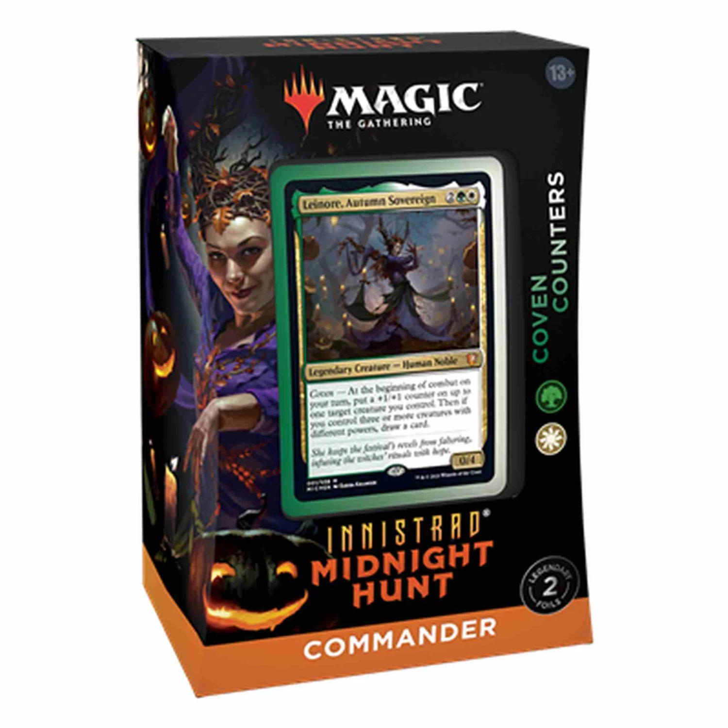 Beschrijving van Magic: The Gathering: Innistrad Midnight Hunt – Commander Deck (Mid) – WOCC8955 : Magic keert terug naar de populaire plane Innistrad!Innistrad: Midnight Hunt will focus on Werewolves, the tribe that is known for its use of the double-faced card mechanic.Elk Commander Deck bevat een deck van 100 kaarten, 1 Commander kaart, 10 tokens, 1 deckbox en 1 life wheel.