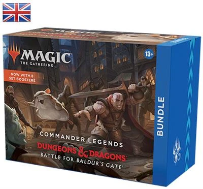 Magic: The Gathering Commander Legends: Battle for Baldur’s Gate Bundle | 8 Set Boosters + Accessories • 8 Commander Legends: Battle for Baldur’s Gate MTG Set Boosters • 1 foil alt-art promo card • 40 basic land cards (20 foil + 20 nonfoil) • Spindown life counter + card storage box • Open a box full of epic MTG Commander cards and accessories from the world of D&D Commander Legends meets D&D in this exciting crossover set! The Commander Legends: Battle for Baldur’s Gate Bundle contains 8 Commander Legends: Battle for Baldur’s Gate Set Boosters—the best boosters to open just for fun—plus exclusive accessories, with 40 basic lands (20 traditional foils and 20 nonfoils), 1 traditional foil promo card with Bundle-exclusive alternate art, 1 oversized Spindown life counter, 1 card storage box, and 2 reference cards. Each Set Booster contains 15 Magic cards, 1 Art Card, and 1 token, ad card, or card from “The List” (a special card from Magic’s history—found in 25% of packs). You’ll find 1–7 cards of rarity Rare or higher, including 1 Foil-Etched card and 1 Traditional Foil, in every pack. A Traditional Foil Land replaces the Land card in 20% of Set Boosters.