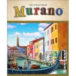 Beschrijving van Murano – MGI3507 : Murano the game is set in Murano, a small group of seven islands near Venice that’s well-known by tourists for its glassmaking. As in Venice, the islands of Murano are separated by canals, so gondolas and transportation are at the heart of this game.The game board depicts the islands of Murano, with the islands being divided up into building sites and walkways. Surrounding the islands is a series of action spaces, with gondolas being present in some number of them at the start of play. On a turn, you move one of the gondolas in the direction of play to an empty space, then take the action shown there. You can’t pass another gondola while moving or land in an occupied space, but for a coin you can move a gondola that’s in front of the gondola you want to move, and you can pay to move multiple gondolas, if needed.Some actions place shops on the islands, with shops coming in different types. You mark a shop to show ownership, and when tourists show up later, they will shop at various stores depending on their proximity and the goods they offer. You also need to take actions to move your personal gondolas to islands so that you can take actions there.Why are you doing all of this activity? To score victory point cards in hand, and actions on the board will let you gain additional VP cards to give you direction to your actions or let you profit from what you’ve already done.You can also use some of the buildings to create glassworks, and those glassworks come into play on the VP cards, through tourist sales, and via an action space shown at the bottom of the game board image that lets you sell different types of glass for money.