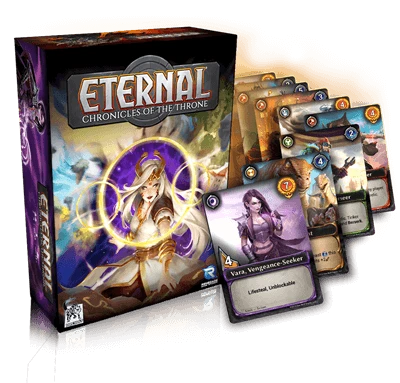 Beschrijving van Eternal Chronicles Of The Throne – RGD2034 : The Eternal Throne sits empty as scions of the royal family struggle for control. Dispatch those who oppose you by recruiting allies to your cause, researching powerful spells, and acquiring valuable relics! From the makers of the award-winning Clank! A Deck-Building Adventure, Eternal: Chronicles of the Throne combines deck-building games and strategy card battlers into an intense strategic experience. Summon powerful allies to attack your opponents, or build an unbreakable defense. Will you exhibit patience and seek the power of the Eternal Throne, or forgo such a risky path? The decisions are yours in Eternal: Chronicles of the Throne!