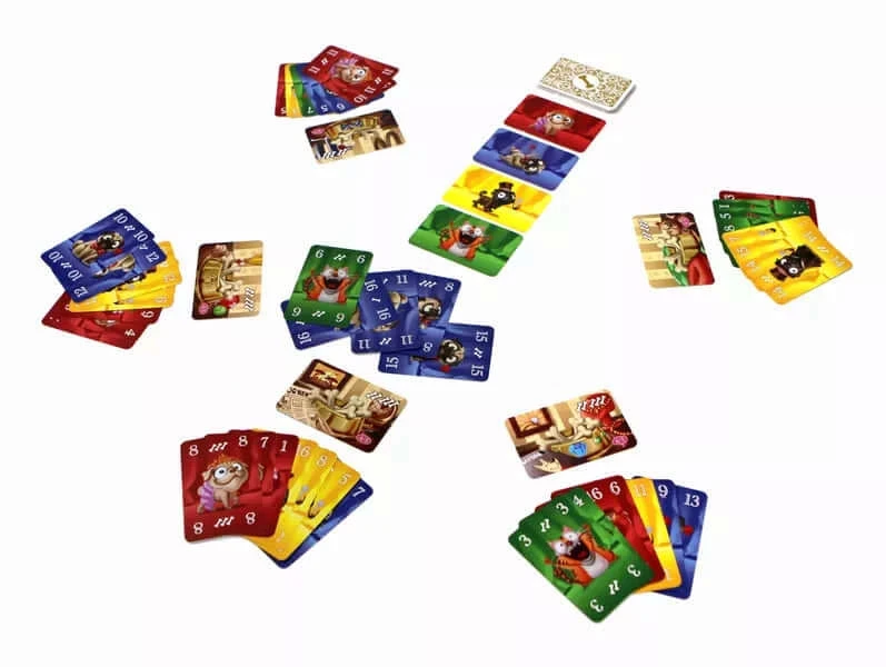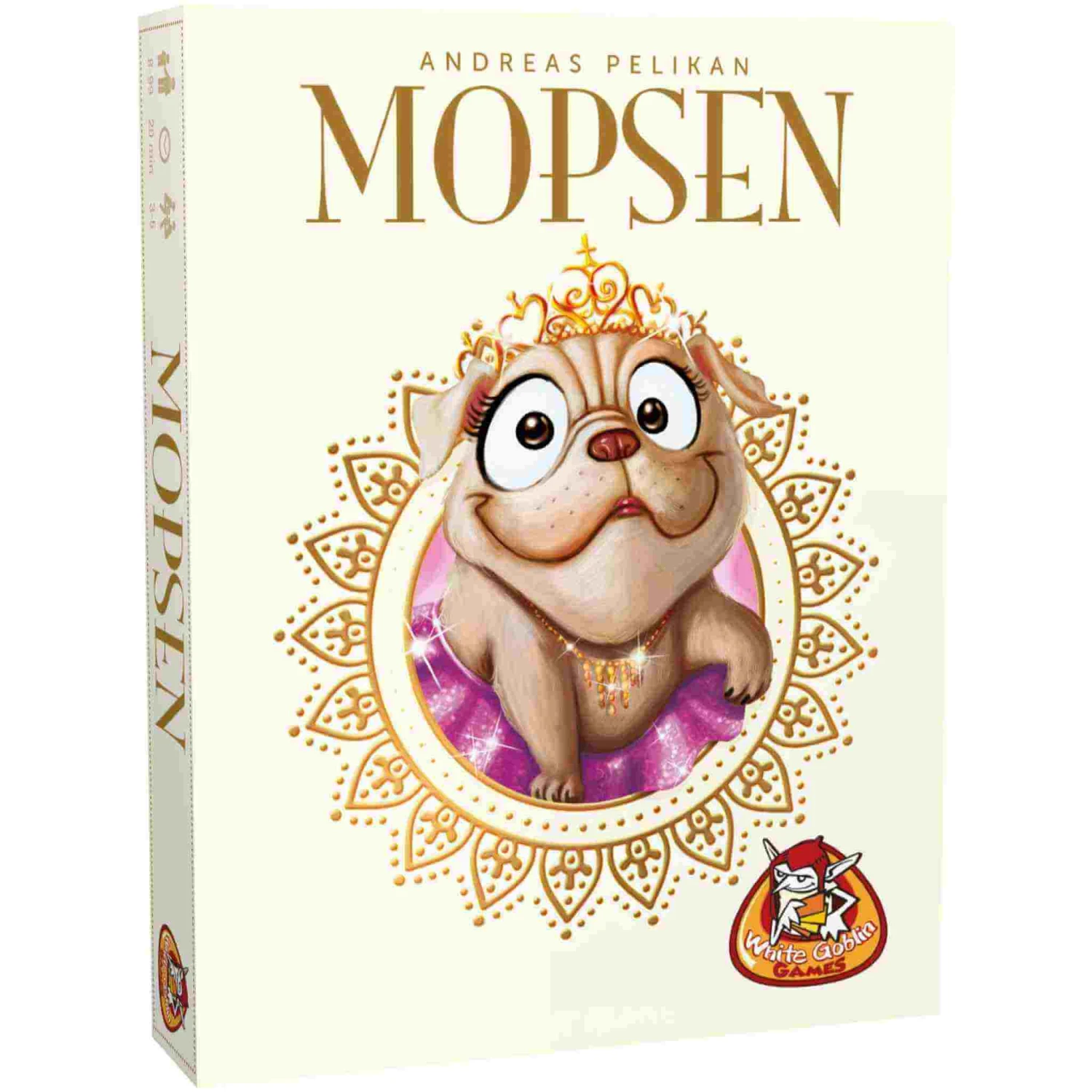 Beschrijving van Mopsen – WGG2049 : Er is zojuist een enorme stapel botten uit de keuken gekomen en de Mopsen worden wild. De dieren kunnen er geen genoeg van krijgen en ieder van hen wil het beste voor zichzelf bewaren. De verwende Mopsen dringen naar voren om eerder dan de rest bij de overheerlijke botten te komen. En dan zijn er ook nog die vervelende katten die alles op zijn kop zetten!Mopsen is een slagenspel voor 3-5 spelers. Zet je Mopsen in op het juiste moment, win de slag en bemachtig de meeste botten in je voerbak!